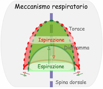 Nella respirazione diaframmatica durante la fase inspiratoria il diaframma si abbassa e la cassa toracica si amplia, grazie soprattutto all’apertura delle costole fluttuanti, le costole libere alla base della cassa. Ne deriva anche una leggera protusione di tutta la parete addominale.